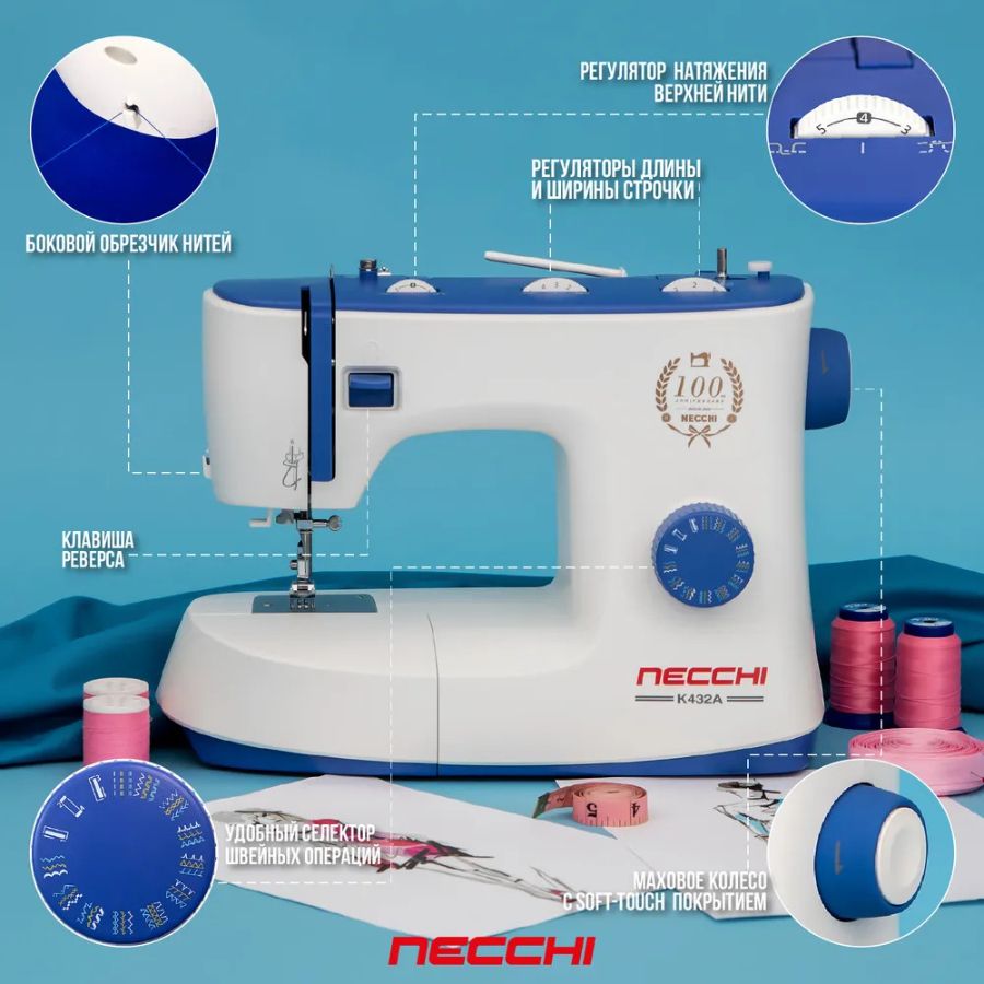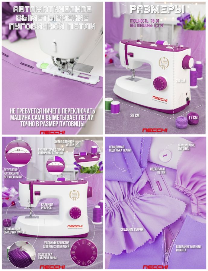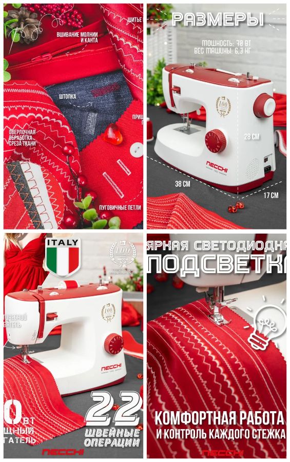 Изысканный дизайн и хорошие функциональные возможности делают эту модель самой выгодной покупкой из всего модельного ряда, созданного к 100–летию бренда NECCHI. Основные швейные строчки, легкая смена лапок и регулировка длины стежка вкупе с вертикальным челноком отлично подойдут для домашнего использования машинки или для тех кто хочет самую простую модель для начинания в шитье.